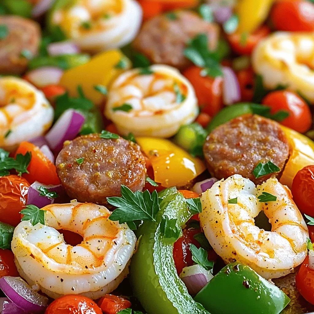 - 1 pound large shrimp, peeled and deveined - 1 pound turkey sausage, sliced into rounds - 2 bell peppers (one red, one green), chopped - 1 medium red onion, chopped - 2 cups cherry tomatoes, halved - 3 tablespoons olive oil - 2 tablespoons Cajun seasoning - 1 teaspoon garlic powder - Salt and pepper to taste - Fresh parsley for garnish Gathering the right ingredients is key to making this dish shine. You need one pound of large shrimp. Make sure they are peeled and deveined. The turkey sausage adds great flavor, and you’ll want one pound of that, too. Slice it into rounds for even cooking. Next, grab two bell peppers — one red and one green. Chop them up into bite-sized pieces. Add a medium red onion, also chopped. For a burst of color and taste, use two cups of cherry tomatoes, halved. You’ll need three tablespoons of olive oil to coat everything nicely. For that Cajun kick, use two tablespoons of Cajun seasoning and one teaspoon of garlic powder. Season with salt and pepper to taste. Finally, fresh parsley adds a pop of color and freshness when you garnish your dish. With these ingredients ready, you can create a flavorful meal everyone will love. - Preheat your oven to 400°F (200°C). This makes sure your dish cooks well. Line a large sheet pan with parchment paper. This helps with easy cleanup later. - In a large bowl, combine 1 pound of large shrimp, 1 pound of sliced turkey sausage, 2 chopped bell peppers (one red and one green), 1 chopped red onion, and 2 cups of halved cherry tomatoes. Mixing these ingredients creates a colorful and tasty dish. - Drizzle 3 tablespoons of olive oil over the mixture in the bowl. Then, sprinkle 2 tablespoons of Cajun seasoning, 1 teaspoon of garlic powder, and add salt and pepper to taste. Toss everything together until well coated. This step is key for flavor! - Spread the mixture evenly onto the prepared sheet pan. Make sure it’s in a single layer. This helps everything cook evenly. - Roast in the preheated oven for 15-20 minutes. Stir halfway through to ensure even cooking. You’ll know it’s done when the shrimp turn opaque and the sausage is heated through. - Once done, remove the pan from the oven and let it rest for a few minutes. This helps the flavors settle. - Garnish with freshly chopped parsley before serving. This adds a nice touch and fresh flavor! To get shrimp just right, follow these tips: - Cook for 15-20 minutes at 400°F (200°C). - Look for them to turn opaque. - Stir halfway through to cook evenly. - Avoid overcooking; they can become rubbery. Perfect shrimp should be tender and juicy. Use a timer to help keep track. Want to amp up the taste? Try these ideas: - Add a pinch of cayenne for heat. - Mix in some smoked paprika for depth. - Fresh lemon juice adds brightness. - Experiment with thyme or oregano for a twist. These simple additions can boost flavor without extra work. Adjust to your taste and enjoy! Cleaning up can be a breeze if you plan right: - Use parchment paper on your sheet pan. - Toss all ingredients in one bowl. - Wipe down surfaces with a damp cloth. - Soak your mixing bowl and utensils right after cooking. With these steps, you’ll spend less time cleaning and more time enjoying your meal! {{image_2}} You can mix up the proteins in this dish. If you want a different flavor, try chicken sausage or pork sausage. Both add great taste and work well with Cajun spices. For shrimp, you could use scallops or even firm white fish. Each protein gives the dish a fresh twist. Cajun flavors pair with many vegetables. You can use zucchini or yellow squash for a tasty option. Other good choices are asparagus, green beans, or even corn. Each veggie adds its own charm and color to the dish. Feel free to get creative and use what you love. This dish goes well with rice, quinoa, or crusty bread. A simple green salad also complements the meal nicely. If you enjoy a bit of heat, serve with hot sauce on the side. These sides add more flavor and texture to your meal, making it a feast everyone will enjoy. To store your leftovers, let the dish cool first. Place it in an airtight container. You can keep it in the fridge for up to three days. Make sure to label the container with the date. This way, you will know how fresh your meal is. When you are ready to eat, you can reheat the dish in several ways. The best way is to use the oven. Preheat your oven to 350°F (175°C). Place the dish in an oven-safe dish and cover it with foil. Heat for about 15 minutes. This method keeps the shrimp and sausage juicy. You can also use a microwave, but it may not keep the same texture. If you want to freeze the dish, do it right after it cools. Use freezer-safe containers or bags. Make sure to remove as much air as possible. This helps prevent freezer burn. You can freeze it for up to three months. When ready to eat, thaw it overnight in the fridge. Then, reheat it in the oven or microwave as mentioned above. Enjoy your delicious meal later! To season shrimp, use Cajun seasoning for a bold kick. I like to mix two tablespoons of Cajun seasoning with garlic powder and a pinch of salt. If you want a milder option, try Old Bay seasoning or lemon pepper. These alternatives give a nice flavor without the heat. You can even add fresh herbs like thyme or parsley for extra taste. Yes, you can prep this dish ahead of time. Chop the veggies and mix the shrimp and sausage with the seasonings. Store everything in the fridge for up to 24 hours. When you’re ready to cook, just spread it on the sheet pan and roast. This method helps save time on busy nights. The shrimp are done when they turn opaque and slightly pink. This usually takes about 15 to 20 minutes in the oven. If you want to be sure, use a meat thermometer. The safe cooking temperature for shrimp is 120°F (49°C). When cooked right, they will be firm and juicy. In this blog post, we explored a delicious Cajun shrimp and sausage recipe. You learned how to prepare ingredients, follow steps