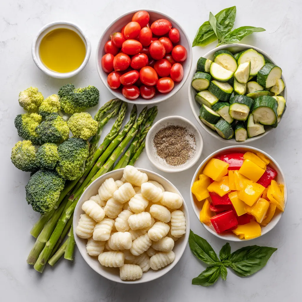 • In a large bowl, combine the gnocchi, cherry tomatoes, bell peppers, zucchini, broccoli, and asparagus.