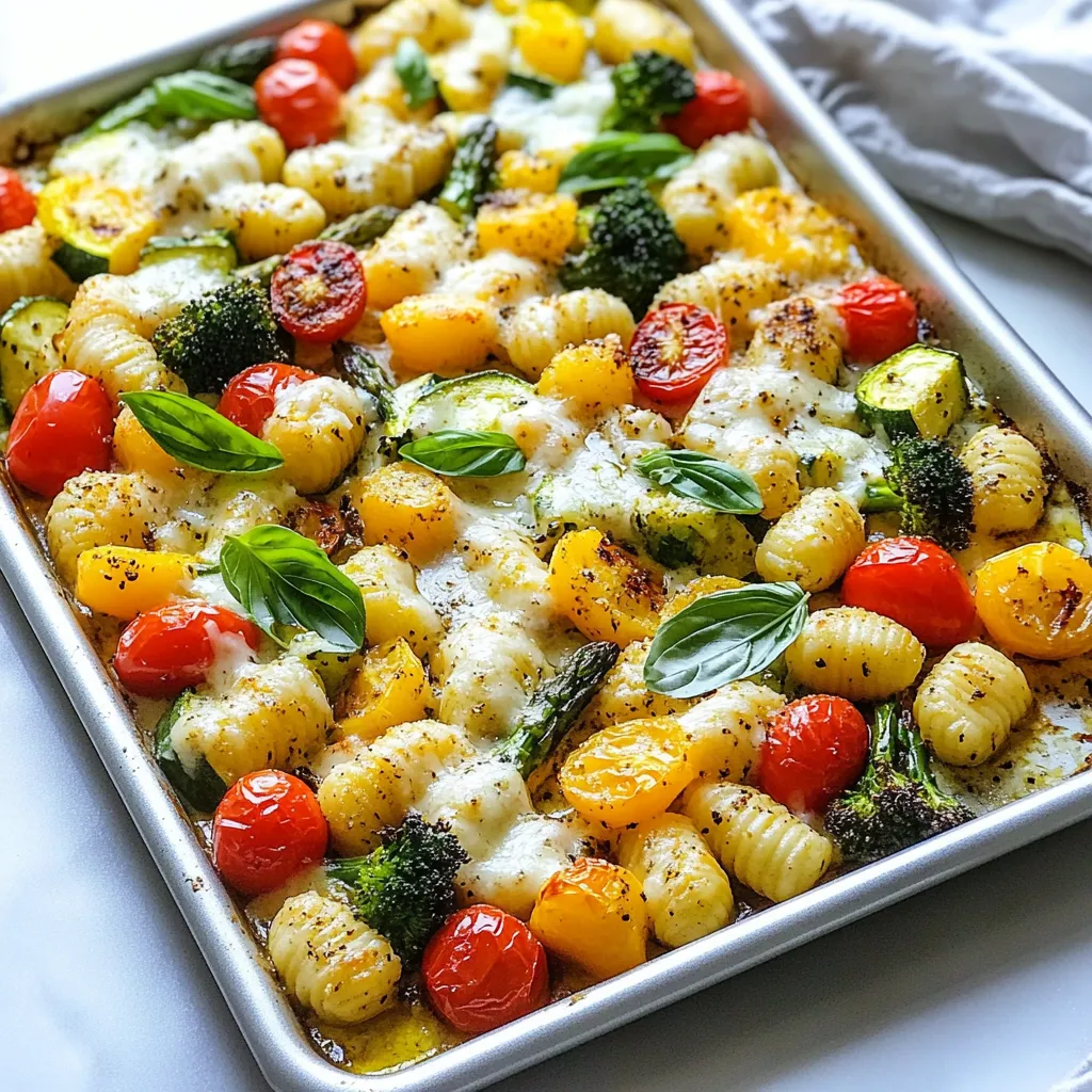 - 1 pound gnocchi (store-bought or homemade) - 1 cup cherry tomatoes, halved - 1 cup bell peppers (mixed colors), diced - 1 cup zucchini, sliced - 1 cup broccoli florets - 1 cup asparagus, trimmed and cut into pieces - 3 tablespoons olive oil - 2 teaspoons Italian seasoning - Salt and pepper to taste - 1/2 cup shredded mozzarella cheese - Fresh basil leaves for garnish These ingredients come together to create a bright and colorful dish. The gnocchi is soft and chewy, while the veggies add crunch and flavor. - Red onion, sliced - Spinach or kale, for greens - Parmesan cheese, for a nutty twist - Lemon zest, to brighten flavors Adding these options can enhance your dish. A splash of lemon zest makes everything pop. You can also mix in some greens for more texture and color. - Extra virgin olive oil, drizzled on top - Freshly cracked pepper for spice - Pine nuts or walnuts for crunch These toppings elevate the dish. A drizzle of olive oil adds richness. Fresh pepper gives a bit of heat, and nuts add a lovely crunch. Feel free to experiment with your favorite toppings! {{ingredient_image_1}} Start by preheating your oven to 425°F (220°C). This will ensure even cooking. Line a large baking sheet with parchment paper. This keeps the gnocchi and veggies from sticking. In a large bowl, add 1 pound of gnocchi, 1 cup of halved cherry tomatoes, 1 cup of diced bell peppers, 1 cup of sliced zucchini, 1 cup of broccoli florets, and 1 cup of trimmed asparagus cut into pieces. This mix gives a colorful and tasty dish. Drizzle 3 tablespoons of olive oil over the mixture. Sprinkle 2 teaspoons of Italian seasoning, salt, and pepper to taste. Toss it all together well. You want everything coated nicely with oil and seasonings. Spread the gnocchi and vegetable mix in an even layer on your baking sheet. This helps everything cook evenly. Place the sheet in the preheated oven and roast for 20 minutes. Halfway through, take it out and toss the mix. This step ensures that every piece gets golden and tender. After 20 minutes, check if they look cooked. If they do, take the sheet out. Sprinkle 1/2 cup of shredded mozzarella cheese evenly over the top. This adds a nice cheesy layer. Put the baking sheet back in the oven for another 5-7 minutes. Keep an eye on it until the cheese melts and bubbles. Once done, take it out and let it cool for a minute. Finally, garnish with fresh basil leaves. This adds a pop of color and flavor. Serve the dish directly from the sheet pan for a fun touch! When I pick vegetables, I look for bright colors and firm textures. Choose cherry tomatoes that are plump and shiny. The bell peppers should feel heavy and have smooth skin. For zucchini, pick ones that are small to medium-sized. Broccoli florets should be bright green and tight. Asparagus should snap easily when bent. Always smell the veggies. Fresh ones have a crisp, clean scent. To get gnocchi just right, don’t overcook them. Boil them until they float, usually 2-3 minutes. If using store-bought gnocchi, follow the package instructions. When you roast them, they get a nice crisp outside and a soft inside. Toss them gently with the veggies for even cooking. This way, every bite is tender yet chewy. If you are short on time, here are my top tips. First, prep your veggies ahead of time. Cut them the night before and store in the fridge. Second, use a pre-made gnocchi. It saves time and still tastes great. Third, clean as you go. This makes the kitchen less messy and cooking more fun. Finally, don’t forget to use the oven! Roasting all at once saves energy and effort. Pro Tips Choose Fresh Vegetables: Use seasonal vegetables for the best flavor and nutrition. Fresh produce will enhance the overall taste of your dish. Don't Overcrowd the Pan: Ensure there's enough space between the vegetables and gnocchi when roasting. This allows for proper browning and crispiness. Experiment with Cheese: While mozzarella is delicious, feel free to mix in other cheeses like Parmesan or feta for added flavor complexity. Garnish for Color: Fresh basil not only adds flavor but also a vibrant color to your dish. Consider adding other herbs like parsley or chives for variety. {{image_2}} You can swap in any veggies you have at home. Try using carrots, peas, or squash. If you find fresh corn, add that for a sweet crunch. For a fall twist, use butternut squash or Brussels sprouts. Just make sure the veggies are cut into similar sizes. This helps everything cook evenly. To make this dish vegan, leave out the cheese. You can add nutritional yeast for a cheesy taste. For gluten-free gnocchi, look for brands made with rice or potato flour. Many stores offer great gluten-free options. Always check labels to ensure they meet your needs. Add fresh herbs to boost the flavor. Basil, parsley, or thyme work great. You can mix in garlic powder or crushed red pepper for some heat. A squeeze of lemon juice before serving can brighten up the dish. Experiment with flavors you love to make this meal your own. To store your Sheet Pan Gnocchi Primavera, first let it cool. Then, place it in an airtight container. Keep it in the fridge for up to three days. If you want to enjoy it later, store the leftovers separately from the mozzarella cheese. This helps keep the cheese from getting soggy. When you’re ready to eat, reheat your gnocchi in the oven. Preheat the oven to 350°F (175°C). Place the gnocchi in an oven-safe dish. Cover it with foil to keep moisture in. Bake for about 15 minutes, or until it's hot. You can also reheat it in the microwave. Use a microwave-safe bowl and heat in 30-second bursts. Stir between heating to warm it evenly. If you want to freeze your gnocchi dish, do it right after cooking. Let it cool completely. Then, portion it into freezer bags or containers. Remove as much air as possible before sealing. Label each bag with the date. It can last up to three months in the freezer. To reheat, thaw it overnight in the fridge first. Then, follow the