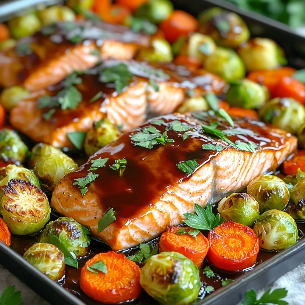 1. Bake the salmon and vegetables: Arrange the glazed vegetables around the salmon on the sheet pan. Bake everything in the preheated oven for about 15 to 20 minutes. The salmon should flake easily with a fork when done, and the veggies will be tender and caramelized.