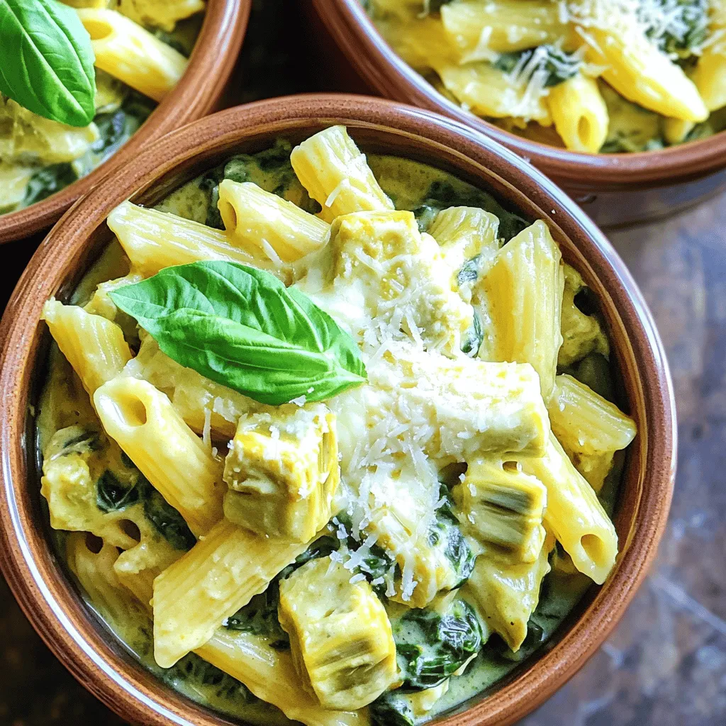 To make Slow Cooker Cheesy Spinach Artichoke Pasta, you will need: - 12 oz pasta (penne or rotini works well) - 1 can (14 oz) artichoke hearts, drained and chopped - 2 cups fresh spinach, roughly chopped - 1 cup cream cheese, softened - 1 cup shredded mozzarella cheese - 1 cup grated Parmesan cheese - 2 cups vegetable broth - 1 tablespoon garlic powder - 1 teaspoon onion powder - Salt and pepper to taste Enhance your dish with these garnishes: - Fresh basil for a pop of color - Extra grated Parmesan for a cheesy touch You can swap ingredients based on your taste or what you have: - Use whole wheat pasta for a healthier option - Swap cream cheese with Greek yogurt for a lighter version - Try different cheese like cheddar or gouda for unique flavors - Replace vegetable broth with chicken broth for a richer taste To start, you need to prepare your slow cooker. Lightly grease the inside with cooking spray or olive oil. This step keeps the pasta from sticking. Make sure to cover all areas. A well-greased slow cooker makes for easy cleanup later! Next, it's time to combine the ingredients. In your slow cooker, add the following: - 12 oz pasta (penne or rotini) - 1 can (14 oz) artichoke hearts, drained and chopped - 2 cups fresh spinach, roughly chopped - 1 cup cream cheese, softened - 1 cup shredded mozzarella cheese - 1 cup grated Parmesan cheese After adding these, pour in 2 cups of vegetable broth. Then, sprinkle: - 1 tablespoon garlic powder - 1 teaspoon onion powder - Salt and pepper to taste Gently stir everything together until well mixed. You want the cream cheese to blend in nicely with the other ingredients. Now, it’s time to cook. Cover the slow cooker and set it to low for 3 hours. If you're short on time, you can set it to high for 1.5 hours. Stir halfway through cooking. This helps the flavors mix well. After cooking, check the pasta. If it still needs more time, cook for another 15-30 minutes on low. When it's ready, give everything one last stir. Adjust the seasoning if needed. Finally, scoop the cheesy spinach artichoke pasta into bowls. Enjoy your tasty creation! Many people rush the cooking time. Always follow the exact time for best results. Stirring halfway helps mix flavors well. If you skip this step, some pasta may cook unevenly. Make sure to check the pasta texture before serving. If it’s too hard, cook a bit longer. Don’t forget to adjust salt and pepper to taste. You can make this dish your own with easy changes. For a bolder taste, add more garlic powder or fresh garlic. A squeeze of lemon juice brightens the flavors, too. If you want a little heat, add red pepper flakes. Fresh basil or parsley adds a nice touch of freshness as well. Serve your pasta in colorful bowls for a fun look. Top each bowl with extra Parmesan cheese. A sprinkle of fresh herbs makes it pop! You can also add a side salad for a complete meal. Remember, a nice presentation makes the dish even more enjoyable! {{image_2}} You can easily add protein to this dish. Cooked chicken or shrimp works great. For chicken, use about 1 pound, diced. For shrimp, 1 pound of peeled shrimp is perfect. Add the protein to the slow cooker with the other ingredients. Both options boost flavor and make the meal heartier. If you want a vegan version, swap out the cheese and cream. Use vegan cream cheese and dairy-free cheese instead. You can also replace the vegetable broth with a homemade blend of water and spices. This keeps the dish creamy without animal products. For added texture, try using chickpeas or tofu. They offer protein while staying plant-based. You can amp up the flavor with various spices. Try adding red pepper flakes for heat or Italian seasoning for more depth. You can also mix in extra veggies like bell peppers, zucchini, or mushrooms. Just chop them up and add them to the slow cooker. They will cook down nicely and add freshness to your pasta. After enjoying your slow cooker cheesy spinach artichoke pasta, store leftovers safely. Use airtight containers to keep the pasta fresh. Allow the dish to cool before sealing it up. You can keep it in the fridge for up to three days. Always label containers with the date for easy tracking. Reheating is simple. You can use the microwave or stovetop. If using a microwave, place a serving in a bowl and cover it. Heat in short bursts, stirring often, until warm. On the stovetop, add a splash of broth to the pasta in a pan. Heat over low, stirring gently until warmed through. This keeps it creamy and delicious. If you want to freeze your pasta, let it cool first. Portion it into freezer-safe bags or containers. Be sure to remove as much air as possible to prevent freezer burn. This pasta can last in the freezer for up to three months. When ready to eat, thaw it overnight in the fridge before reheating. Yes, you can use frozen spinach. It saves time and is easy to use. Just thaw and drain it before adding it to the slow cooker. Frozen spinach has a softer texture than fresh, but it still tastes great. Be sure to squeeze out excess water. This way, your dish won't be too watery. You can use many types of pasta. Penne and rotini are great, but you can also try shells or farfalle. Just make sure to adjust the cooking time if you use a different shape. The key is to cook it until it’s al dente. This way, the pasta will hold its shape and texture. To add some heat, try adding red pepper flakes. Start with a small amount, about 1/4 teaspoon, and taste as you go. You can also add diced jalapeños or spicy sausage for extra flavor. Another option is to add a dash of hot sauce at serving time. Adjust the spice level to fit your taste buds. This post covered key aspects of your slow cooker recipe, from ingredients to variations. You learned about essential items, options for garnish, and smart swaps. I shared step-by-step instructions to ensure your dish turns out great. We talked about common mistakes and how to enhance flavors. Remember, adjustments matter depending