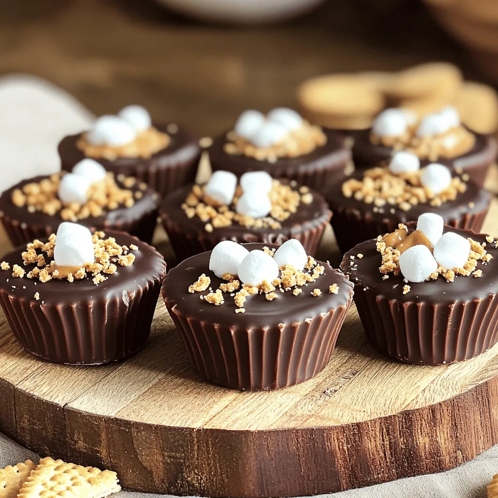 To make S’mores Peanut Butter Cups, gather these ingredients: - 1 cup graham cracker crumbs - 1/2 cup unsweetened cocoa powder - 1/2 cup creamy peanut butter - 1/4 cup powdered sugar - 1/4 cup honey or maple syrup - 1 cup semi-sweet chocolate chips - 1/2 cup mini marshmallows - Pinch of salt These ingredients give your cups that classic s’mores flavor with a rich twist. The graham cracker crumbs and cocoa powder form a tasty base. The peanut butter and sugar create a smooth filling. The chocolate adds a sweet touch, while the marshmallows provide that gooey texture. If you don't have certain ingredients, you can swap them out. Here are some easy changes: - Use digestive biscuits instead of graham crackers for a different crunch. - Swap unsweetened cocoa powder with dark cocoa for a richer taste. - Use almond butter or cashew butter instead of peanut butter if you want variety. - Maple syrup can replace honey for a vegan option. - You can use dark chocolate chips if you prefer a less sweet flavor. These substitutions keep the spirit of the recipe while letting you explore new tastes. You can make S’mores Peanut Butter Cups a bit healthier too. Consider these options: - Use whole grain graham crackers for more fiber. - Replace powdered sugar with coconut sugar for a lower glycemic index. - Choose natural peanut butter with no added sugar or oils. - Use sugar-free chocolate chips to cut down on sugar. - Try using mini fruit pieces instead of marshmallows for a fruity twist. These alternatives help you enjoy the treat while keeping it a bit lighter. To start, gather your ingredients. You will need graham cracker crumbs, cocoa powder, peanut butter, powdered sugar, honey, chocolate chips, marshmallows, and a pinch of salt. 1. In a mixing bowl, combine the graham cracker crumbs, cocoa powder, and salt. This mix makes a great base. 2. In another bowl, mix peanut butter, powdered sugar, and honey until smooth. This will be your filling. Melting chocolate is key to your cups. You can use a microwave or a double boiler. - Microwave: Place half the chocolate chips in a bowl. Heat in short bursts of 20 seconds. Stop and stir between each burst until smooth. - Double Boiler: Fill a pot with water and heat it on low. Place a heat-safe bowl on top, then add the chocolate chips. Stir until melted. Let the melted chocolate cool slightly before using. Now it's time to build your cups! 1. Line a muffin tin with cupcake liners. 2. Spoon a teaspoon of melted chocolate into each liner. Spread it to cover the bottom. 3. Chill the tin for about 10 minutes until the chocolate hardens. 4. Add a spoonful of the peanut butter mix on top of the chocolate. Spread it evenly. 5. Sprinkle mini marshmallows over the peanut butter layer. 6. Melt the remaining chocolate chips. Pour this over the marshmallows, covering them fully. 7. Use a spatula to smooth the chocolate. Tap the tin on the counter to remove air bubbles. 8. Chill for at least 30 minutes or until firm. 9. When ready, peel the cups away from the liners and enjoy! These steps will help you create delicious S’mores Peanut Butter Cups. Happy cooking! To create great layers for your S’mores Peanut Butter Cups, you need careful steps. Start with a well-mixed chocolate base. Melted chocolate must be cool but still pourable. Spoon it into each cupcake liner, covering the bottom well. Chill the tin to let it set. When adding the peanut butter layer, don't rush. Spread it slowly and evenly. This keeps each layer distinct and tasty. Follow these steps for a beautiful treat. Store your S’mores Peanut Butter Cups in an airtight container. This keeps them fresh and tasty. Place parchment paper between layers if stacking them. It prevents sticking and helps keep their shape. For best taste, keep them in the fridge. They stay firm and delicious that way. If you have leftovers, enjoy them within a week. Sometimes, you may face issues while making these cups. If the chocolate doesn’t set, it could be too warm. Let it cool longer before pouring. If the layers mix, try chilling each layer longer. This helps keep them separate. If they are hard to remove from the liners, gently run a knife around the edges. This should help lift them out easily. {{image_2}} You can easily change the flavors of your S’mores Peanut Butter Cups. Try using dark chocolate chips instead of semi-sweet ones for a richer taste. You can also swap in white chocolate for a fun twist. If you love mint, add a few drops of mint extract to the peanut butter mixture. Another idea is to mix in some crushed cookies or candy bars to the filling. Each new flavor can make these treats even more special. For those who need dietary changes, there are great options. Use almond or cashew butter instead of peanut butter for nut-free cups. If you're avoiding sugar, try sugar-free chocolate chips and a sugar substitute in the filling. You can also use gluten-free graham crackers for a gluten-free version. These small changes can make a big impact while keeping the fun flavors. You can compare this recipe to other S’mores-inspired treats. Some recipes use cookie dough as a base, while others layer in cheesecake. Each version gives a new taste and texture. My S’mores Peanut Butter Cups stand out for their creamy filling and rich chocolate layers. Try different recipes to find your favorite. You might even mix and match ideas from each recipe to create your dream dessert! To keep your S’mores Peanut Butter Cups fresh, store them in an airtight container. Place a layer of parchment paper between layers to avoid sticking. Keep the container in the fridge. This method keeps the cups firm and tasty. You can freeze these cups for a longer shelf life. Wrap each cup in plastic wrap or foil. Then, place them in a freezer-safe bag or container. This way, they stay fresh for up to three months. To enjoy, just thaw them in the fridge overnight. When stored properly, S’mores Peanut Butter Cups last about one week i