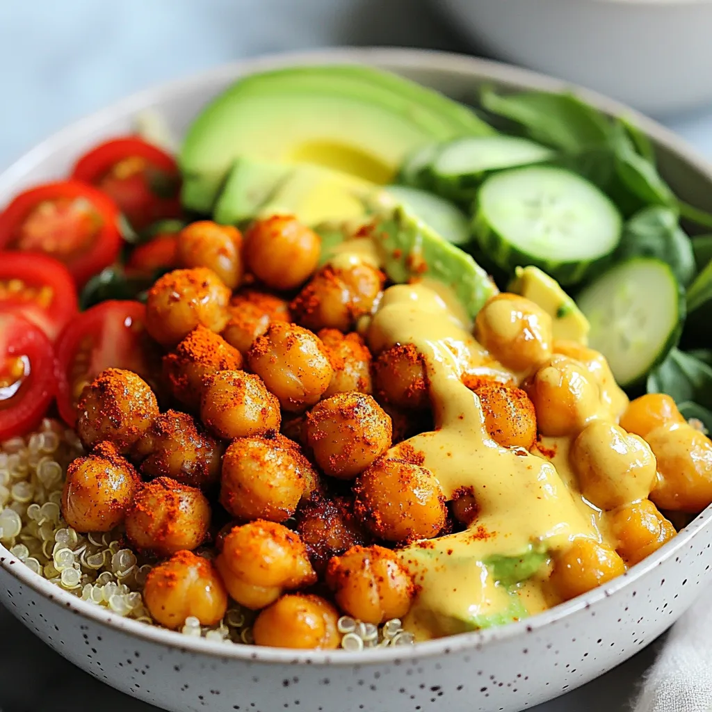 To make a Spicy Chickpea Buddha Bowl, gather these key ingredients: - 1 can (15 oz) chickpeas, drained and rinsed - 2 tablespoons olive oil - 1 tablespoon smoked paprika - 1 teaspoon cayenne pepper - 1 teaspoon garlic powder - Salt and pepper to taste - 1 cup quinoa, rinsed - 2 cups vegetable broth - 1 cup cherry tomatoes, halved - 1 cucumber, diced - 1 avocado, sliced - 1 cup baby spinach or kale - 2 tablespoons tahini - 2 tablespoons lemon juice - 1 teaspoon maple syrup (optional) - Fresh cilantro or parsley for garnish When making this dish, you will need a few tools: - Large bowl for mixing - Baking sheet for roasting - Medium saucepan for cooking quinoa - Small bowl for dressing - Whisk or fork for mixing - Measuring spoons and cups for accuracy You can easily swap some ingredients if needed: - Use dried chickpeas instead of canned; just soak and cook them first. - Swap quinoa for brown rice or couscous for a different grain. - Try different vegetables like bell peppers or carrots for variety. - If you want a creamier dressing, add yogurt to the tahini mix. - For a nut-free option, use sunflower seed butter instead of tahini. {{ingredient_image_1}} First, preheat your oven to 400°F (200°C). This will help the chickpeas get nice and crispy. In a large bowl, mix the drained chickpeas with olive oil, smoked paprika, cayenne pepper, garlic powder, salt, and pepper. Make sure every chickpea is well coated. This spice mix gives the chickpeas a bold flavor. While the chickpeas roast, you can cook the quinoa. Boil 2 cups of vegetable broth in a medium saucepan. Once boiling, add 1 cup of rinsed quinoa. Lower the heat, cover, and simmer for 15 minutes. The liquid will absorb, and the quinoa will become fluffy. After 15 minutes, remove it from heat and let it sit covered for another 5 minutes. For the tahini dressing, take a small bowl. Whisk together 2 tablespoons of tahini, 2 tablespoons of lemon juice, and a pinch of salt. If you like a bit of sweetness, add 1 teaspoon of maple syrup. Gradually mix in water, one tablespoon at a time, until the dressing is smooth. Adjust the consistency to your liking. Now it’s time to put it all together! Grab your serving bowls. Start with a generous scoop of cooked quinoa at the bottom. Next, add the roasted chickpeas. Then, top with halved cherry tomatoes, diced cucumber, avocado slices, and a handful of baby spinach or kale. Finally, drizzle the tahini dressing over each bowl. Don't forget to garnish with fresh cilantro or parsley for a pop of color! To get crispy chickpeas, drain and rinse them well. After that, pat them dry with a towel. This step helps remove excess moisture. In a bowl, mix chickpeas with olive oil, smoked paprika, cayenne pepper, garlic powder, salt, and pepper. Toss them until they are well coated. Spread the seasoned chickpeas in a single layer on a baking sheet. Roast them at 400°F for 20-25 minutes. Make sure to shake the pan halfway through to ensure even crispiness. You want them to be golden and crunchy. For a delicious Buddha bowl, start with a base of fluffy quinoa. Top it with your crispy chickpeas. Add fresh cherry tomatoes and diced cucumber for a burst of color and flavor. Slices of creamy avocado add richness. Finally, toss in some baby spinach or kale for extra nutrition. Drizzle the tahini dressing over the top for a smooth finish. Don't forget to garnish with fresh cilantro or parsley. This adds a nice touch and enhances the flavor. If you have leftovers, store them in an airtight container. Separate the chickpeas, quinoa, and fresh veggies to keep them fresh. Place the tahini dressing in a small jar. This way, everything stays crisp and tasty. Refrigerate the container and eat within three days. When ready to enjoy, reheat the chickpeas and quinoa. Mix in the fresh veggies and drizzle with dressing. Your meal will still taste great! Pro Tips Enhance Flavor: For an extra depth of flavor, consider marinating the chickpeas in the spices for an hour before roasting. Perfect Quinoa: To avoid mushy quinoa, make sure to rinse it thoroughly before cooking to remove any bitterness. Texture Balance: Add some roasted nuts or seeds for a crunchy texture contrast in your Buddha bowl. Storage Tips: This dish keeps well in the fridge for up to 3 days. Store ingredients separately for best quality. {{image_2}} You can boost protein in your spicy chickpea Buddha bowl. Try black beans, lentils, or tofu. Each option adds flavor and texture. You can even use grilled chicken or shrimp if you like. These proteins mix well with the spicy chickpeas. They keep the meal filling and satisfying. Use seasonal vegetables to keep your bowl fresh and exciting. In summer, add zucchini or bell peppers. In fall, try roasted sweet potatoes or Brussels sprouts. You can also use seasonal greens. Swap baby spinach for arugula or Swiss chard. This keeps your Buddha bowl vibrant and tasty all year long. This recipe is already vegan and can be gluten-free. Make sure to use gluten-free quinoa to keep it safe. Check tahini brands for cross-contamination if gluten is a concern. You can also add a splash of coconut aminos for extra flavor. These simple swaps let everyone enjoy this healthy meal. The Spicy Chickpea Buddha Bowl is packed with good stuff. Each ingredient adds vital nutrients. Chickpeas provide protein and fiber. They help keep you full. Quinoa offers complete protein and many vitamins. It has iron and magnesium. Fresh veggies like cucumber and tomatoes add hydration and vitamins. Avocado brings healthy fats. Tahini contributes calcium and more good fats. This bowl is a balanced meal. Chickpeas are great for your heart. They lower cholesterol and improve digestion. Quinoa is gluten-free, making it a smart choice for many. It helps with muscle repair and energy. Leafy greens like spinach or kale are full of antioxidants. These help fight disease. Olive oil is a healthy fat that can reduce inflammation. Spices like cayenne boost metabolism and