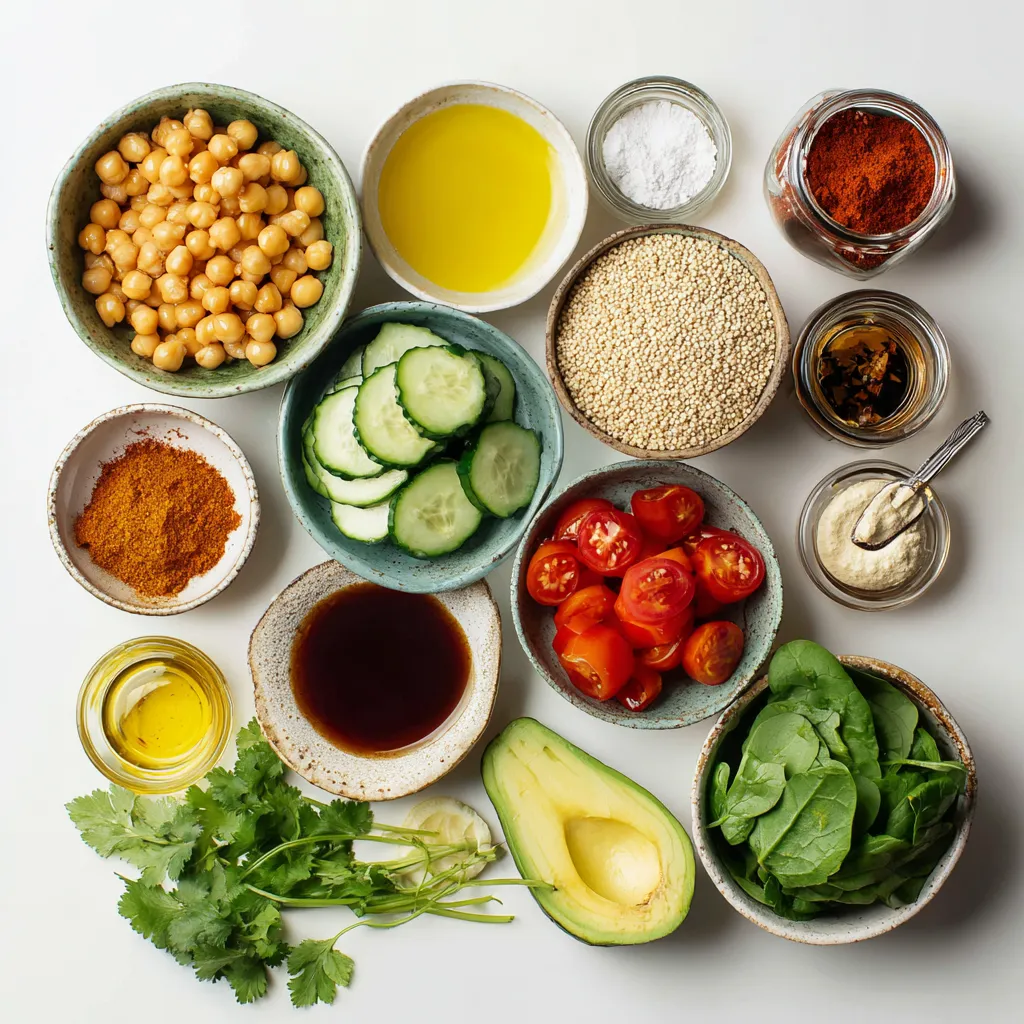 • In serving bowls, place a generous scoop of cooked quinoa. Top with roasted chickpeas, halved cherry tomatoes, diced cucumber, avocado slices, and a handful of baby spinach or kale.