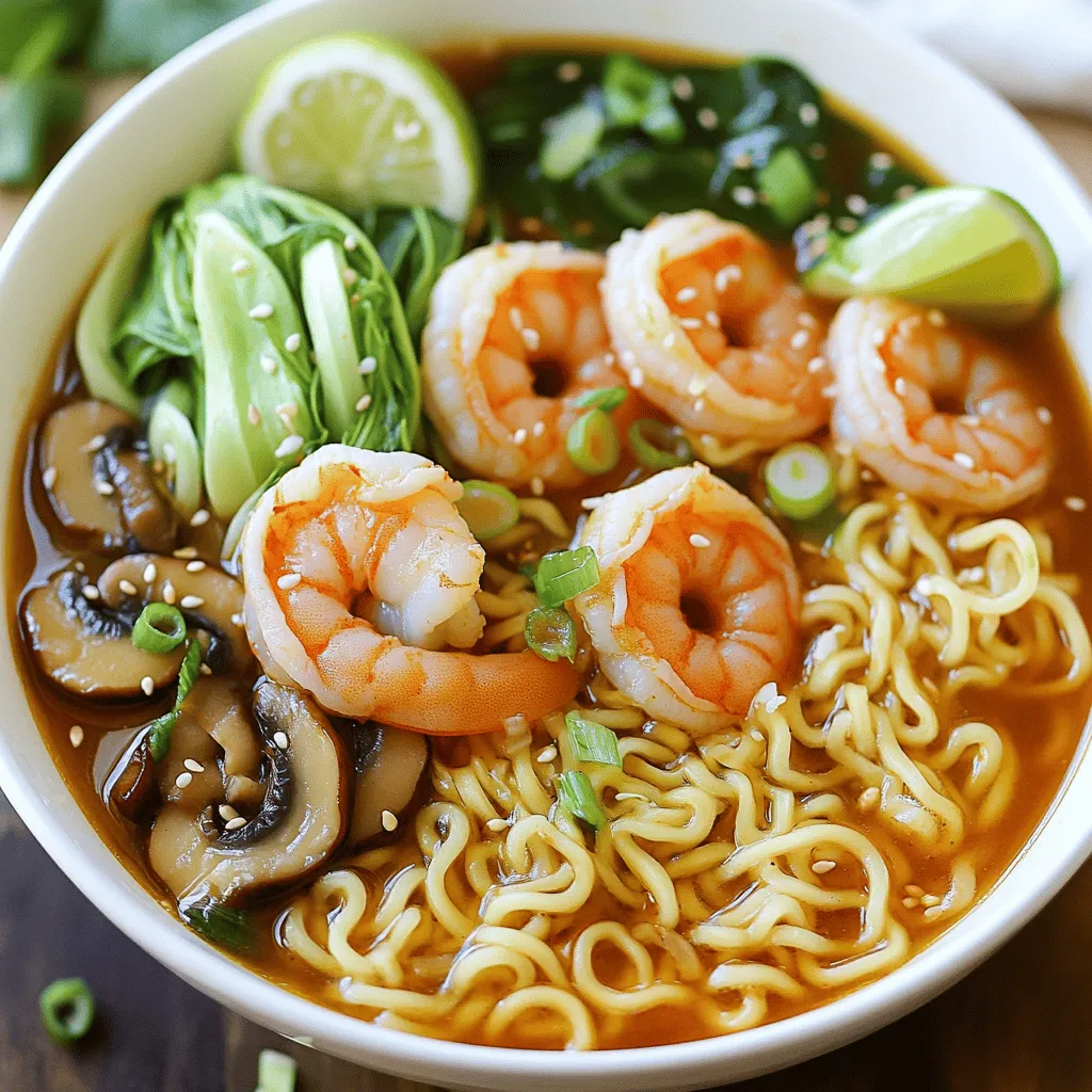 - 200g fresh shrimp, peeled and deveined - 150g ramen noodles - 4 cups vegetable or seafood broth The main ingredients give this dish its heart. Fresh shrimp brings sweet seafood flavor. Ramen noodles add a chewy texture. Vegetable or seafood broth serves as a warm base. - 2 tablespoons soy sauce - 2 teaspoons sriracha (adjust to taste) - 1 teaspoon sesame oil Flavor enhancers turn good into great. Soy sauce deepens the umami taste. Sriracha adds heat and excitement. Sesame oil gives a nutty richness to the broth. - 1 tablespoon ginger, grated - 2 cloves garlic, minced - 1 green onion, finely sliced - 1 cup baby bok choy, halved - 1/2 cup shiitake mushrooms, sliced Fresh additions make the dish vibrant. Ginger and garlic offer aromatic notes. Green onions add a fresh crunch. Baby bok choy and shiitake mushrooms provide color and nutrition. This is a full flavor experience. Each ingredient plays a role, creating a balanced and delicious bowl. For complete details, check out the Full Recipe. Start by heating sesame oil in a large pot over medium heat. Add minced garlic and grated ginger. Sauté them for about one minute until they smell great. Next, pour in four cups of vegetable or seafood broth. Bring it to a gentle simmer. Add soy sauce and sriracha to the broth. You can adjust the sriracha for your heat level. Let this simmer for five minutes to blend all the flavors. While the broth simmers, it's time to cook the ramen noodles. Follow the package instructions, which usually takes about four to five minutes. Once done, drain the noodles and set them aside, keeping them warm. In the simmering broth, add the fresh shrimp. Cook them for about three to four minutes until they turn pink and opaque. Then, toss in sliced shiitake mushrooms and halved baby bok choy. Cook for another two to three minutes until the bok choy is tender. Now, divide the cooked ramen noodles into bowls. Carefully ladle the shrimp broth mixture over the noodles. For a beautiful finish, garnish with sliced green onions and sesame seeds. Serve with lime wedges on the side for that zesty touch. Enjoy your flavor-packed delight! For the complete cooking guide, check the Full Recipe. To make your spicy shrimp ramen bowls shine, adjust the spice to your taste. Start with a small amount of sriracha and add more if you want more heat. Simmer your broth gently. This helps the flavors mix and grow. A longer simmer means a deeper taste. Cooking shrimp well is key. Add shrimp to the broth when it simmers, and cook for just 3-4 minutes. Watch them closely. Once they turn pink and opaque, they are done. For ramen, follow the package directions closely. Drain them lightly, so they stay firm and do not get mushy. Make your dish visually appealing. Garnish with sliced green onions and a sprinkle of sesame seeds. This adds color and crunch. Serve with lime wedges on the side. This adds a fresh burst of flavor right before you eat. For the complete dish, check out the Full Recipe. {{image_2}} You can easily swap shrimp for tofu or chicken. Tofu gives a nice plant-based vibe. Chicken adds heartiness and flavor. Both options work well in this dish. For vegetables, consider using: - Spinach instead of bok choy - Bell peppers for a crunch - Carrots for sweetness These swaps keep your ramen exciting and fresh. You have two main choices for broth: homemade or store-bought. Homemade broth is rich and full of flavor. It takes time but is worth it. Store-bought broth is quick and convenient. Choose a high-quality brand for the best taste. You can also experiment with different flavors. Try adding miso for depth. Coconut milk can bring creaminess. Adjust the spices to create a unique broth each time. Extra toppings can elevate your ramen bowls. Consider these garnishes: - Sliced radishes for crunch - Fresh cilantro for brightness - Soft-boiled eggs for richness You can also add more protein and veggies. Try using: - Grilled chicken for extra protein - Edamame for a boost of nutrients - Snap peas for a fresh bite These additions keep your meal fun and flavorful. For the full recipe, check the section above! To keep your spicy shrimp ramen fresh, store it in the fridge. Use an airtight container to prevent any smells from mixing. Ideally, you should eat leftovers within 2 days. This will ensure it stays tasty and safe to eat. When you are ready to reheat, the best method is on the stove. Pour the ramen into a pot over medium heat. Stir gently to warm it evenly. If you use a microwave, place it in a safe dish and cover it loosely. Heat in short bursts, checking often. This helps keep the noodles from getting mushy. Yes, you can freeze spicy shrimp ramen bowls! However, it’s best to freeze the broth and noodles separately. Use freezer-safe containers and leave some space for expansion. It can stay fresh in the freezer for up to 3 months. When you want to eat it, thaw overnight in the fridge and reheat as mentioned above. Enjoy your meal anytime! I always prefer fresh shrimp. Fresh shrimp tastes better and has a firmer texture. It cooks quickly and absorbs flavors well. However, frozen shrimp is also a good option. It is often just as tasty if thawed properly. Make sure to buy high-quality shrimp whether fresh or frozen for the best results. Yes, you can easily make this dish gluten-free. Look for gluten-free ramen noodles in stores. There are many options available now. For the broth, choose a gluten-free soy sauce. This way, you can enjoy a tasty bowl without gluten. If you want to lower the heat, reduce the amount of sriracha. You can also skip the chili flakes altogether. Add more broth or coconut milk to balance the spice. This will still keep your ramen flavorful without the burn. For a complete meal, try serving this ramen with a simple salad. A cucumber salad or a side of edamame works well. You can also add some spring rolls or dumplings for a fun twist. Each side complements the noodles and shrimp nicely. You now know how to make spicy sh