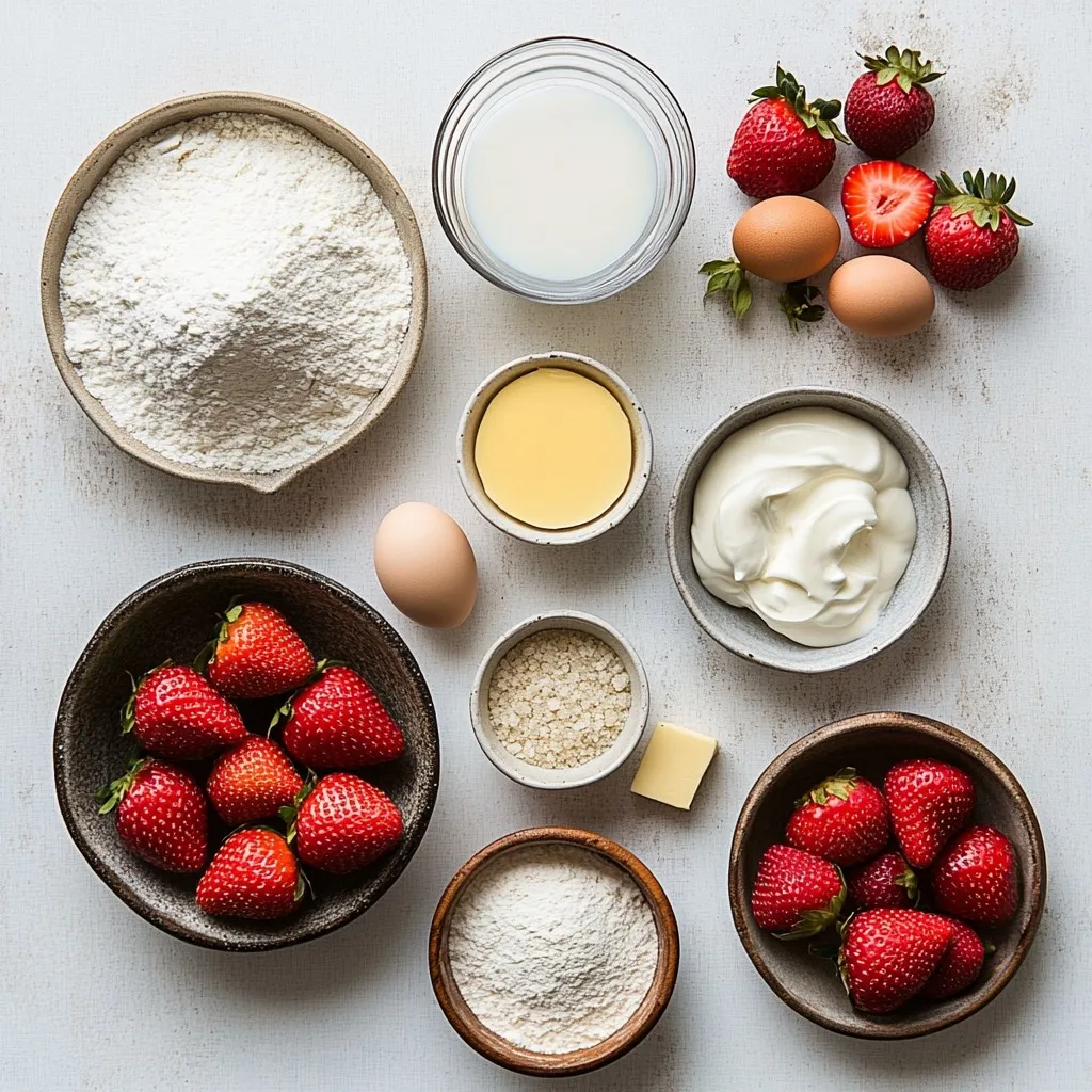 Gather these simple ingredients to make your strawberries and cream milk cake. The flour gives it structure, while sugar adds sweetness. Baking powder helps the cake rise, and salt enhances all the flavors. Softened butter makes the cake rich and moist. Whole milk is key for a tender crumb, and eggs bind everything together. Vanilla extract adds warmth and depth.