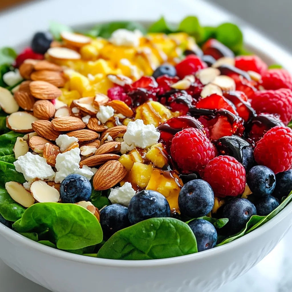 Start with clean spinach. Wash it well to remove dirt. Dry it gently in a salad spinner or with paper towels. This keeps the leaves crisp. Layer the salad for a pretty look. Place spinach first, then add the mixed berries. Top with feta and almonds. Toss gently to keep the berries whole.