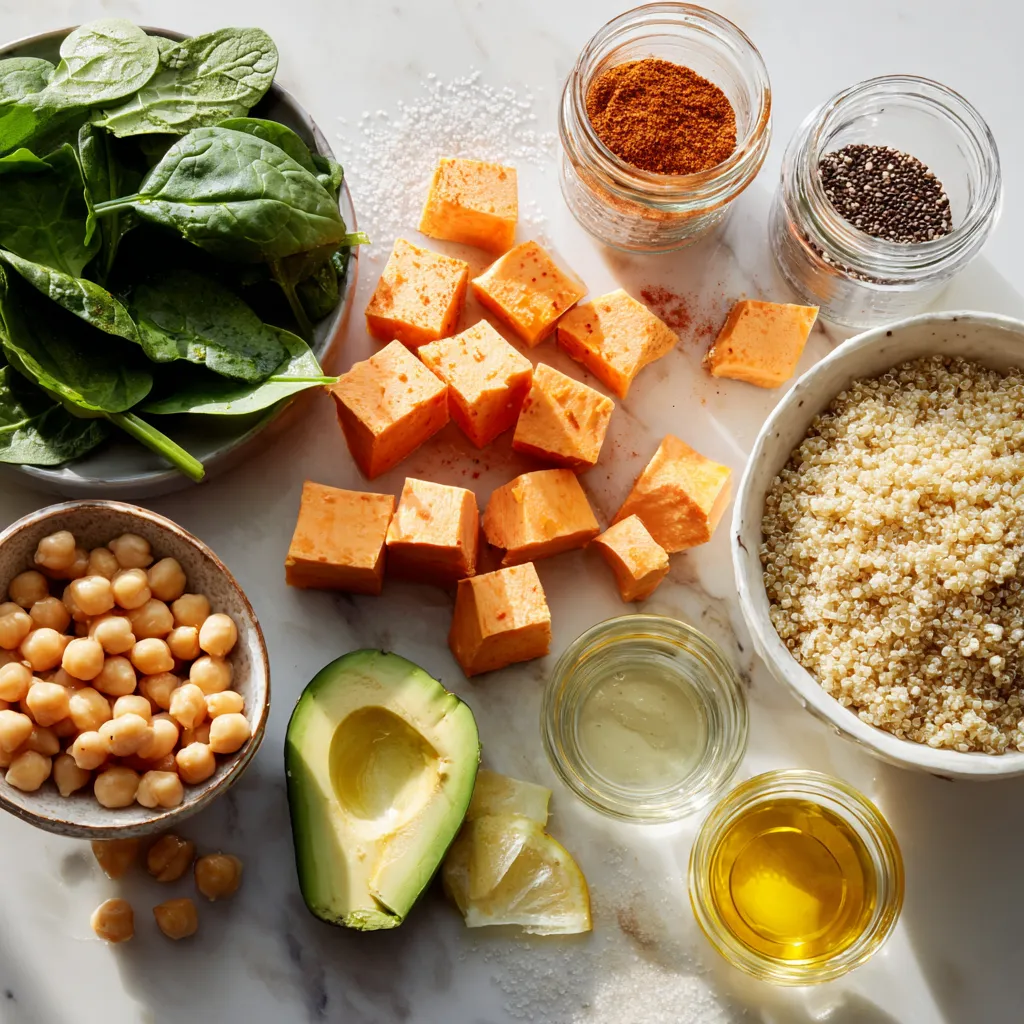 For this Sweet Potato Chickpea Buddha Bowl, I love using fresh and simple ingredients. Sweet potatoes offer natural sweetness and are rich in vitamins. Chickpeas add protein and fiber, which makes the meal filling. Olive oil brings a nice richness and helps roast the veggies.