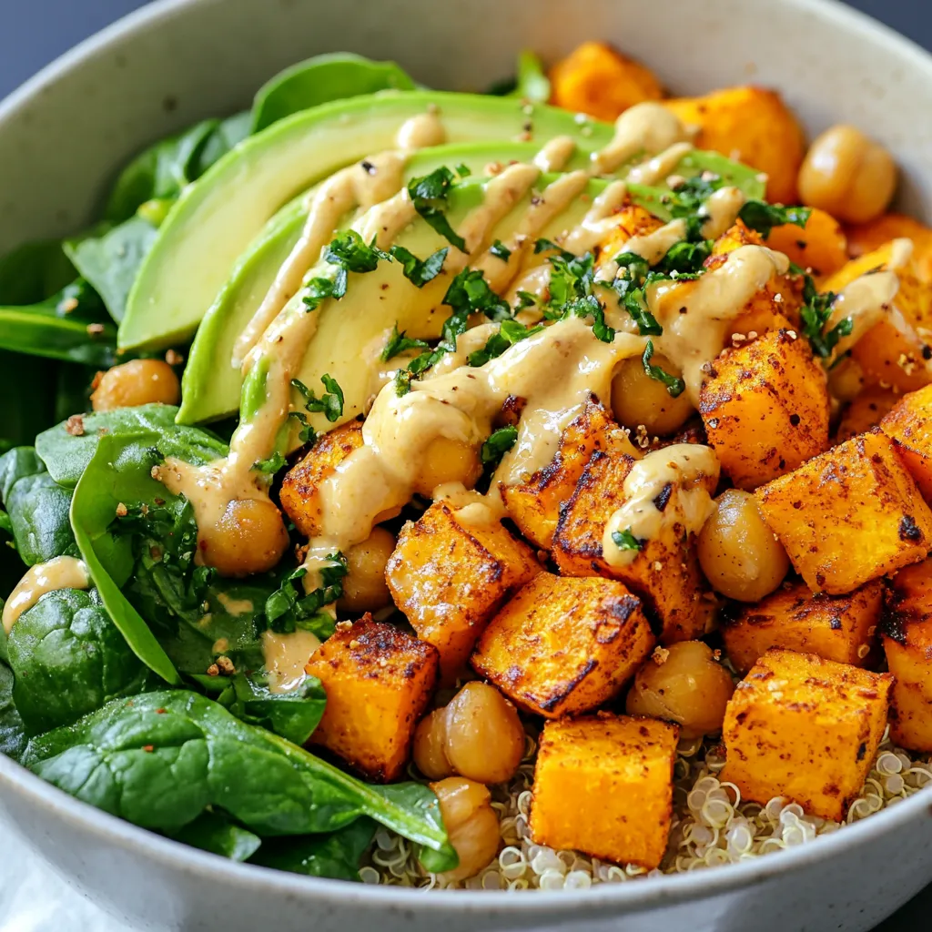 Once the sweet potatoes and chickpeas are roasted and golden, it’s time to build your Buddha bowl. Start with a base of 2 cups cooked quinoa in each bowl. Next, add your roasted sweet potatoes and chickpeas. Pile on some fresh 2 cups spinach leaves and 1 sliced avocado for creaminess. Finally, drizzle your tahini dressing generously over the top. Enjoy right away for a tasty and healthy meal!