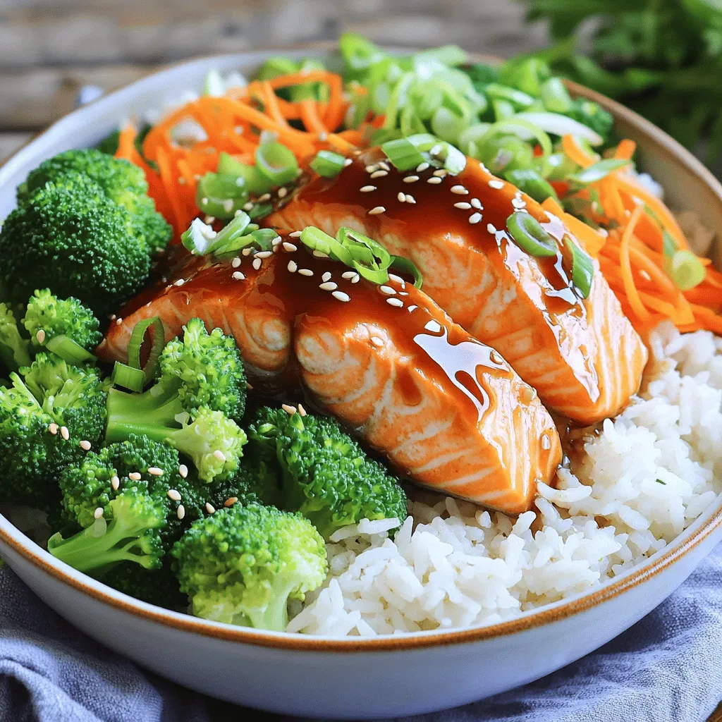 Now it’s time to put everything together. Start with a scoop of jasmine rice at the bottom of each bowl. The rice acts as a base, soaking up all the flavors. Next, add steamed broccoli and shredded carrots on top. Finally, place the cooked salmon fillet right in the center. Drizzle it with more teriyaki sauce. To finish, sprinkle sliced green onions and sesame seeds on top. If you like, add pickled ginger on the side for extra flavor. Enjoy your delicious teriyaki salmon rice bowl!