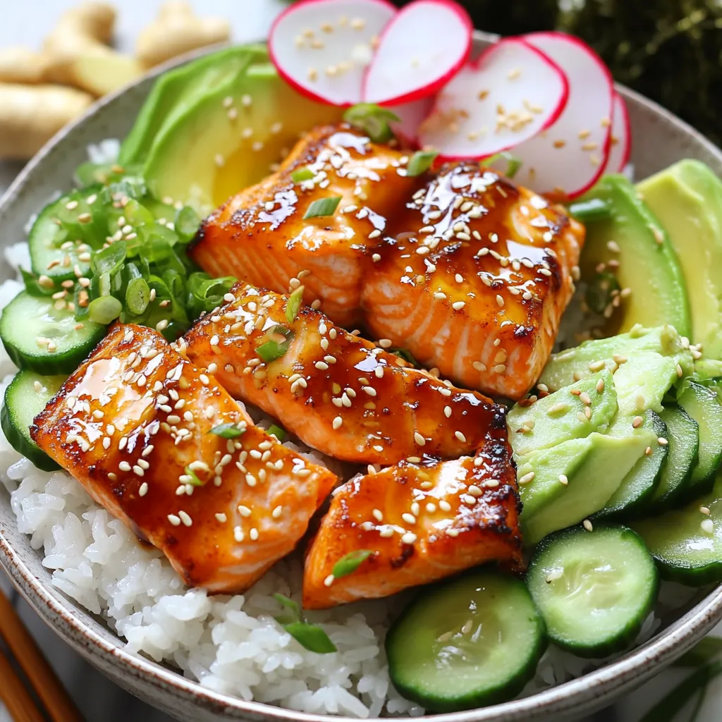 To build your rice bowl, fluff the cooked sushi rice with a fork. Lightly season it with a pinch of salt. In serving bowls, divide the rice as a base. Place the salmon fillets on top. Next, arrange the avocado, cucumber, and radish slices around the salmon. This adds color and crunch. Sprinkle toasted sesame seeds and chopped green onions on top. If you like, add nori strips for extra texture. Serve with pickled ginger on the side. This gives a nice zing and completes your meal!