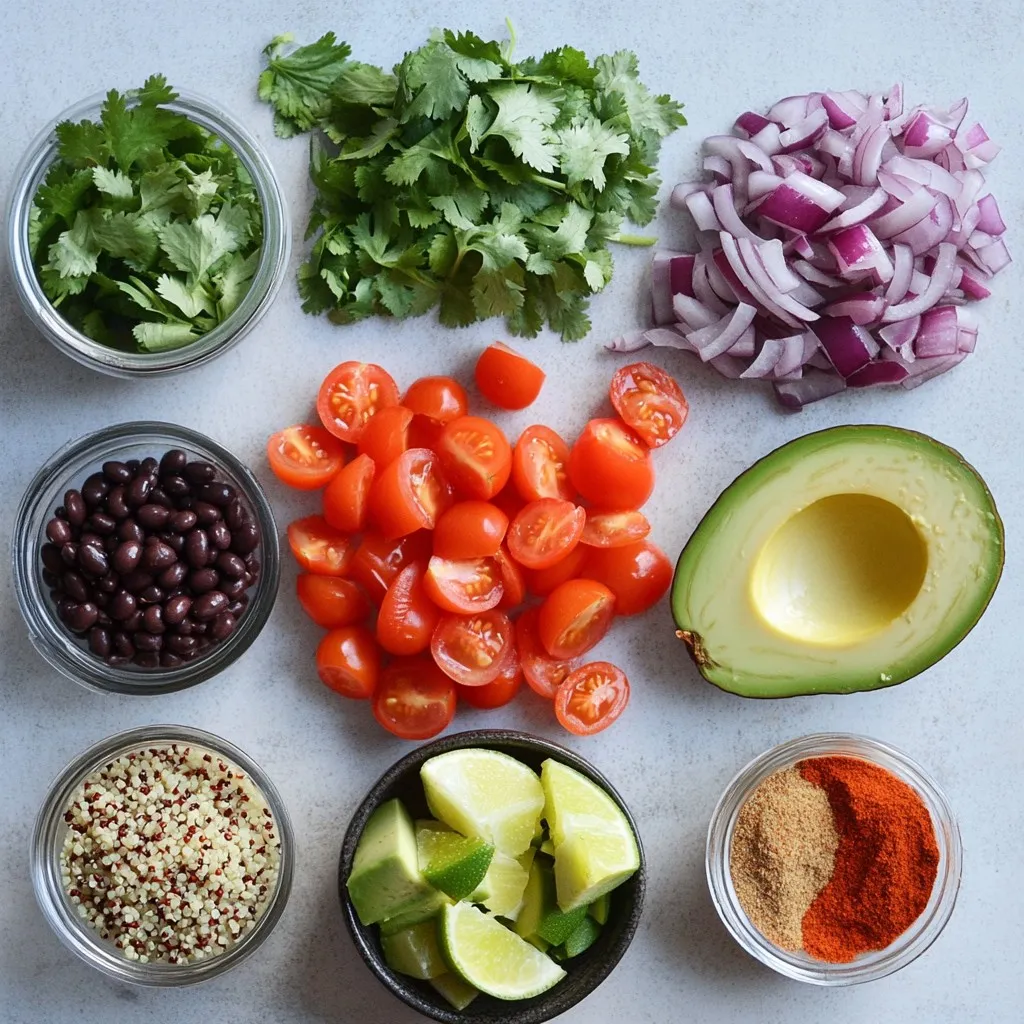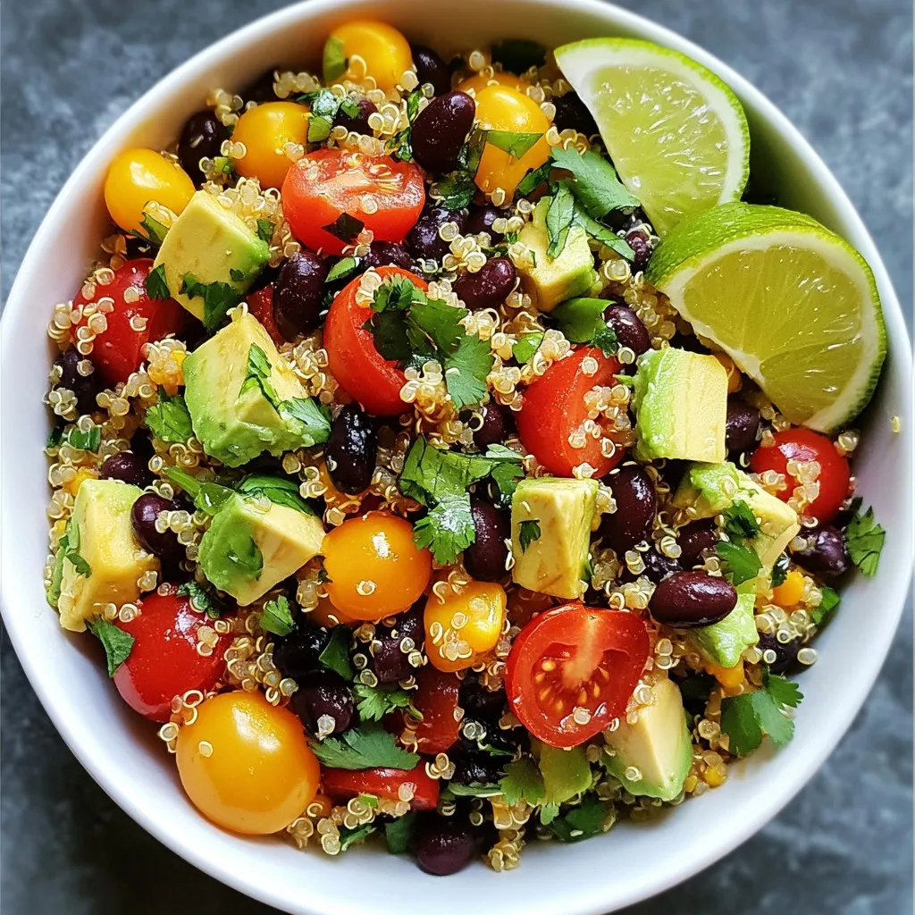 Each ingredient plays a key role in this salad. The quinoa gives a great base, and the black beans add protein. The cherry tomatoes and red bell pepper bring color and sweetness. The red onion adds a slight bite, while the avocado offers creaminess. For the dressing, lime juice and olive oil make it bright and fresh. Cumin and smoked paprika add warmth. Don’t forget salt and pepper to taste!
